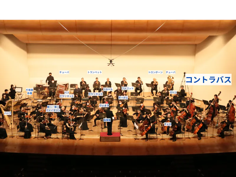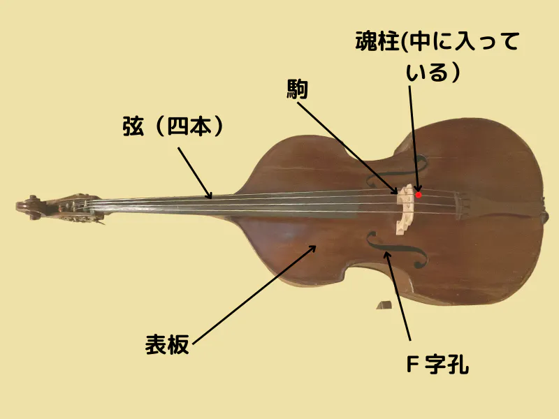 そもそもコントラバスの音はどこから出ているか?というと、弓や指で弦を振動させ、それが駒を通って魂柱からつたわり楽器全体が震えて増幅し、楽器全体から発せられます。それがまわりの空気を振動させて耳だけでなく、生で聴くと全身が倍音に包まれます。部屋にある軽い物が、周波数を拾ってカタカタ動いたりします。