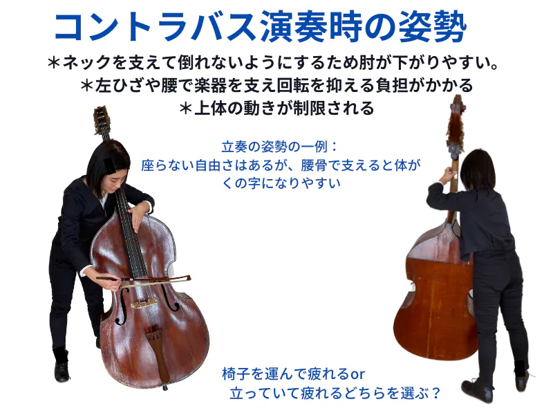 コントラバスでは、楽器を支えるために前向きの力が必要で、弓(アルコ)や指(ピッチカート)で弦を自分のほう又は横向きに力をかけることで音を出していますね。奏者の脳や骨格・神経・筋肉は相反する作業を行っていて、それは相当なストレスです。椅子により楽器が支えられれば、ストレスが激減します。演奏という、神経も集中力もいる作業に集中することができれば,,,最高のパフォーマンスを上げられます。」
