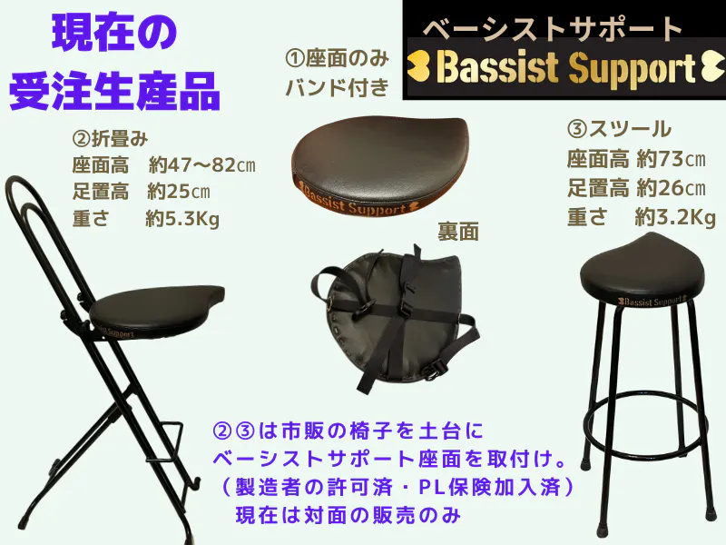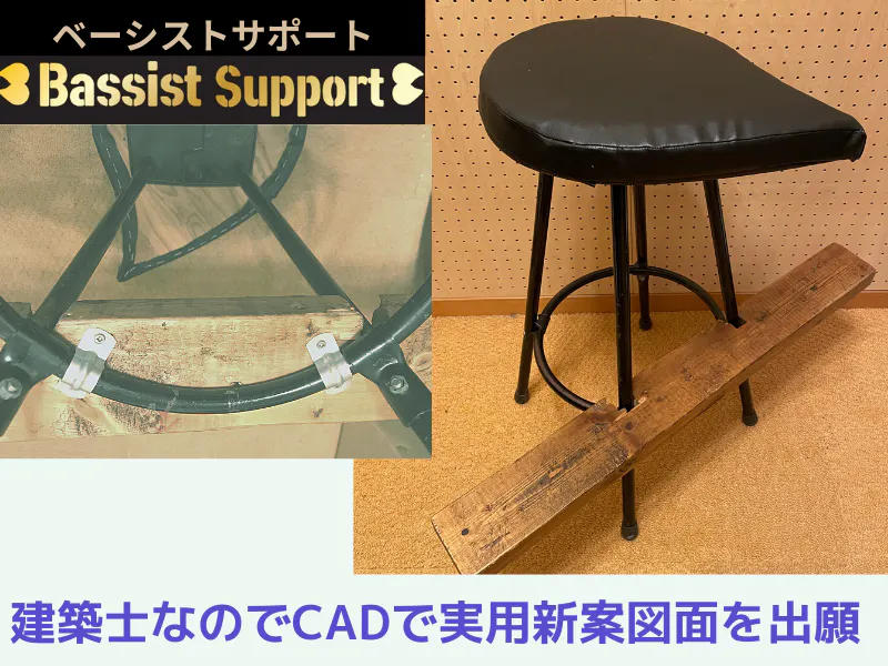 もともと、日曜大工やハンドメイドが好きで、アパレルと建築の仕事の経験から思いついた発明品。ルネセイコウLP-800ジャンボベストワークチェア及び、市販のスツールに「ベーシストサポート」の座面を付けて、楽器店さんに試しに展示して頂きますが、高級感のある店内では作りの粗さが目立ち、とても恥ずかしくなりました。