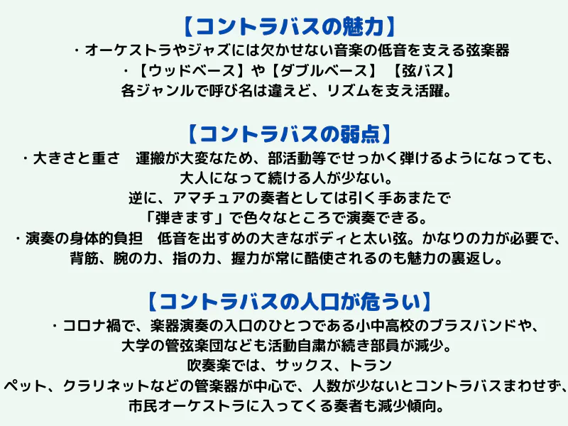 これまでお世話になったコントラバスと皆さんに恩返しをして、未来の仲間を増やしたい!
