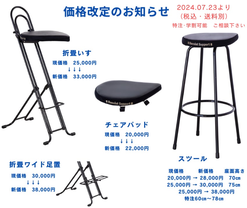 2024/07/13 16:15ベーシストサポートは、1人でも多くの奏者に使ってもらうため価格維持に努めて参りましたが、7月23日より価格を改定いたします。ここまで、開発者がコントラバス奏者の声を取り入れて試作を繰り返し、型紙や設計、生産工程決め、発注、材料調達、広報、印刷物の製作、オンラインショップの運営、梱包出荷まで一貫して行い、品質と価格のバランスを探ってきました。この間、自宅でのハンドメイドから工場への生産委託へと切替え、グレードアップした製品はどこへ出しても恥ずかしくないクオリティです。材料も確かなメーカーのものを使用し、特殊な座面は大量生産が難しく1つづつ職人が手作りしています。その結果、物価高騰のあおりも受け原価は当初の約2倍となっております。しかし、たどり着いた結論は、それぞれ世界で1つの大切な楽器と皆様の体を支え、繊細な演奏の場で安心して使えること。価格改定とブランド化が事業継続に不可欠と判断しました。価格改定前 改定後 7月23日 注文分よりチェアパッド 2万円 → 2万2千円スツール 2万円 → 2万8千円折畳み椅子 2万5千円 → 3万3千円折畳みワイド足置 3万円 → 3万8千円一人でも多くの方に使って頂きたい思いは変わらず、学割価格の導入や楽器店様での販売の拡充も行います。これからも、突起で支えるコントラバス椅子「ベーシストサポート」を通してコントラバス奏者の方の最高のパフォーマンスのお手伝いができるよう進めてまいります。ご支援者のかた、もしお知り合いでご購入を検討中のお知り合いがいらしたら、お早めの注文をお声がけいただけると幸いです。オンラインショップ もっと見る