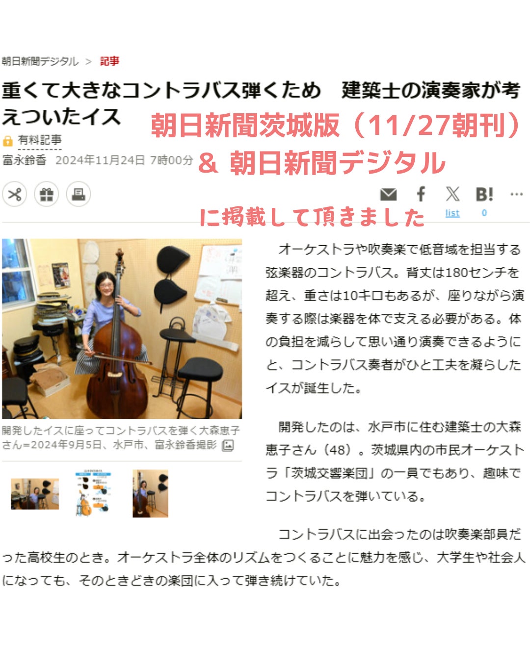 2024/11/28 08:00朝日新聞デジタル 重くて大きなコントラバス弾くため 建築士の演奏家が考えついたイス朝日新聞さんにベーシストサポートについて、取材記事を掲載していただきました。前回のメディア掲載は2年弱前、クラウドファンディングのお知らせのタイミングでした。その記事からのご支援や、存在を知っていただいたこと、とても有難いものでした。今回は、商品化しているため、ご支援者様、ユーザー様、椅子の製作協力業者さんへの責任を背負って身が引き締まる思いです。メディア掲載の機会、下記のシェアボタンなどでご紹介いただければ助かります。 もっと見る