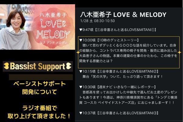 ニッポン放送 八木亜希子さんの ラブ アンド メロディ1/28(土)10時のグッとストーリーのコーナーにて、 コントラバス椅子開発のことを取り上げて頂きました。