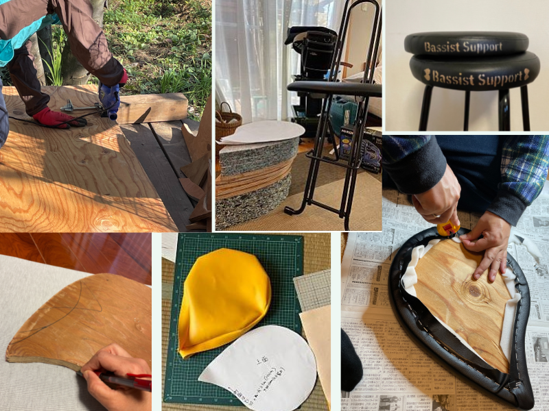 もともと、日曜大工やハンドメイドが好きで、アパレルと建築の仕事の経験から思いついた発明品。ルネセイコウLP-800ジャンボベストワークチェア及び、市販のスツールに「ベーシストサポート」の座面を付けて、楽器店さんに試しに展示して頂きますが、高級感のある店内では作りの粗さが目立ち、とても恥ずかしくなりました。