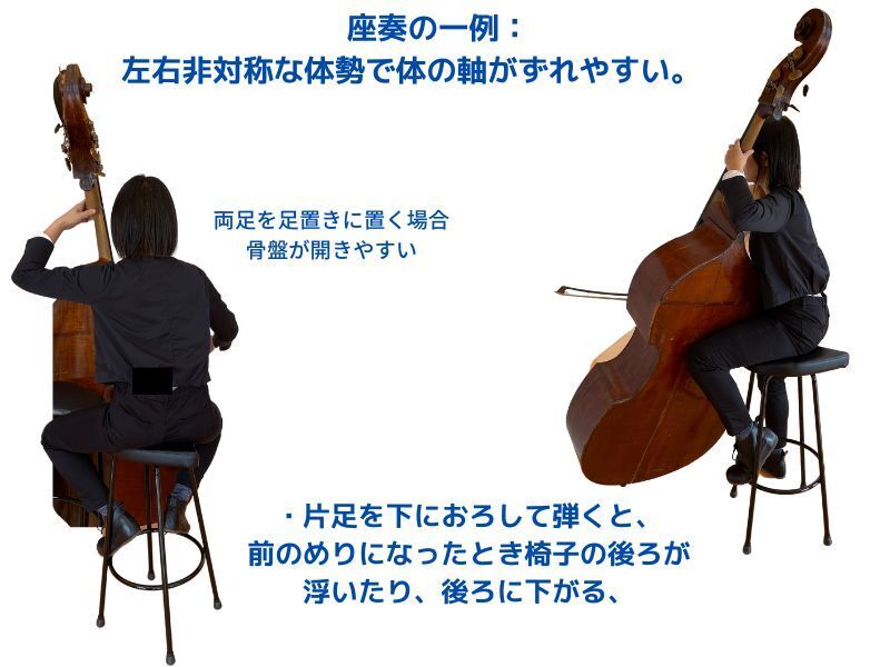 コントラバスでは、楽器を支えるために前向きの力が必要で、弓(アルコ)や指(ピッチカート)で弦を自分のほう又は横向きに力をかけることで音を出していますね。奏者の脳や骨格・神経・筋肉は相反する作業を行っていて、それは相当なストレスです。椅子により楽器が支えられれば、ストレスが激減します。演奏という、神経も集中力もいる作業に集中することができれば,,,最高のパフォーマンスを上げられます。」