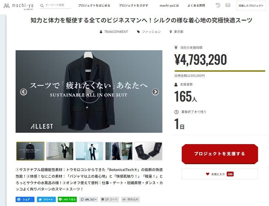 ありがとうございます。ALLEST です。いよいよプロジェクトは本日終了です。暖かいご支援本当にありがとうございました。まだ数時間ありますが、2023年上半期でのクラファンスーツ単体の売上はMakuakeとMachi-ya累計1,000万円を超えスーツ部門では堂々の1位となります。(自社調べ)感謝しかありません。プロジェクトは終わりますが、引き続きインスタやLineでコミュニケーションが取れると幸いです。よろしくお願いいたします。