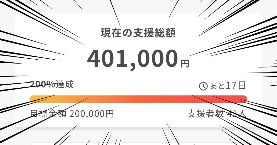 こんにちは!プロジェクトオーナーのトランポリン系ゆーたです!この度、初日の目標金額達成に続き、ネクストゴール(目標金額40万円)も達成しました!いや、みなさんのお力で達成させていただきました!!!!本当にありがとうございます。北海道新聞さんに掲載された効果もあってか、また急速に伸びてネクストゴール達成となりました。近況報告としましては、今同時進行で色々なことが少しずつ進んでいる状況です。なので目立った報告は今のところできせんが、1つ1つ確定し次第この場でご報告させていただきます。おそらく目立った報告ができるようになってくるのは4月に入ってからになりそうです。引き続き、当プロジェクトを見守っていただければと思います。まだまだご支援・拡散いただけると嬉しいです!よろしくお願いします!