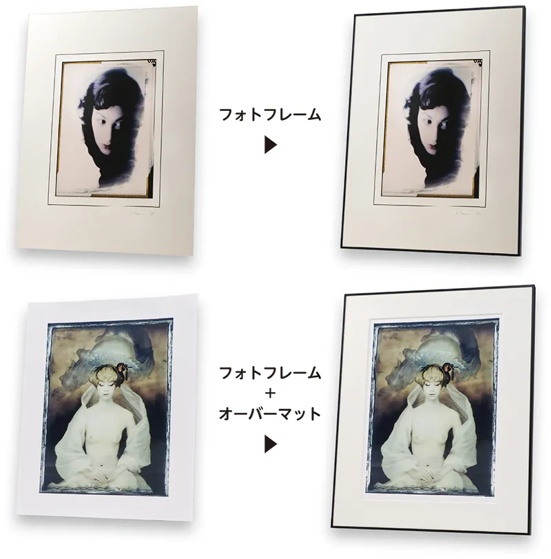 額装のない全ての「ラムダプリント裏打オーバーマット仕上」および「特殊加工 特製オーバーマット仕上(ベルギー個展)」作品に、野波浩がフォトフレームをセットしてお届けします。