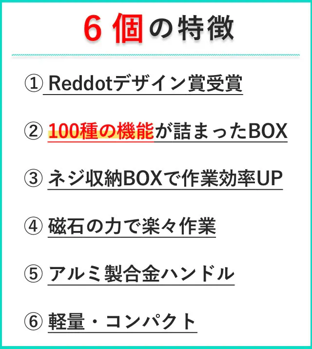 ドライバーハンドル先端と、下段ケースビット収納部には磁石が内蔵されており、ビット交換時にカチッとビットを固定するため、ビットを落としてしまう心配が要りません!