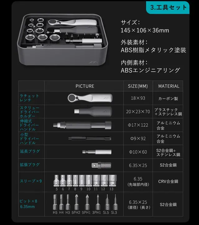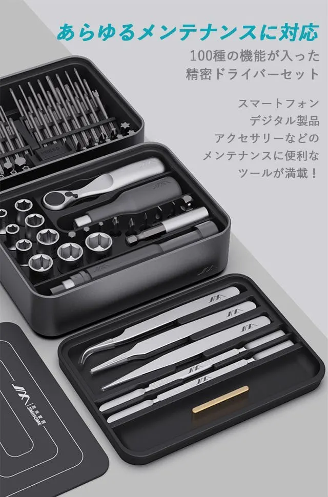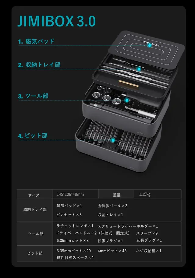 JIMIBOX 3.0には、DIYや精密機器の修理で活躍する全100種のツールが揃っているため、追加でビットやピンセットなどのツールを購入する必要はありません。