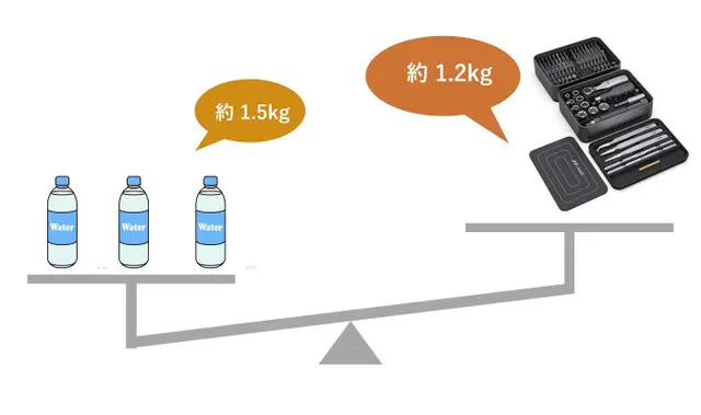 JIMIBOX 3.0の総重量は、100種ものツールが詰まっているのに、1.5Lのペットボトルよりも軽い、たった1.15Kg。