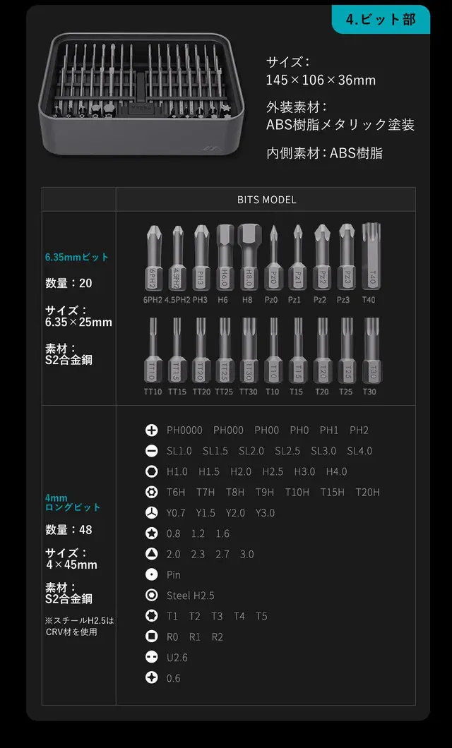 ■ビットには耐久性、耐錆性に優れたS2合金を使用しております。※H2.5のみCRV鋼製