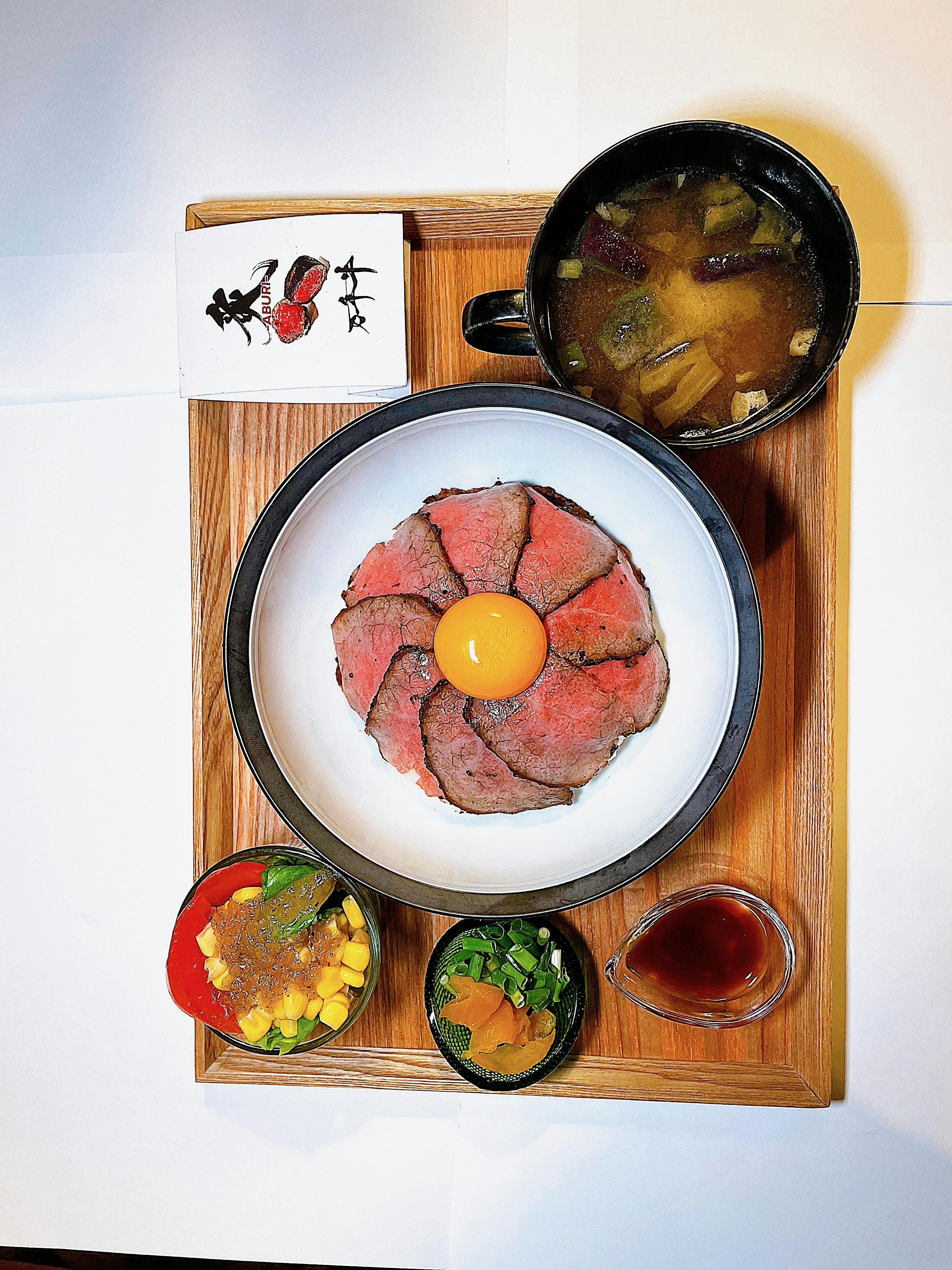 先日の炙レセプションパーティーで出品した、万年牛の炙ABURI御膳です‼︎レギュラーサイズで70gのローストビーフが乗っています!卵に少しのポン酢が相性抜群です!グレイビーソースやワサビ醤油はお好みですが、あまりつけない方がいいかも…素材の旨みを堪能していただきたいです‼︎