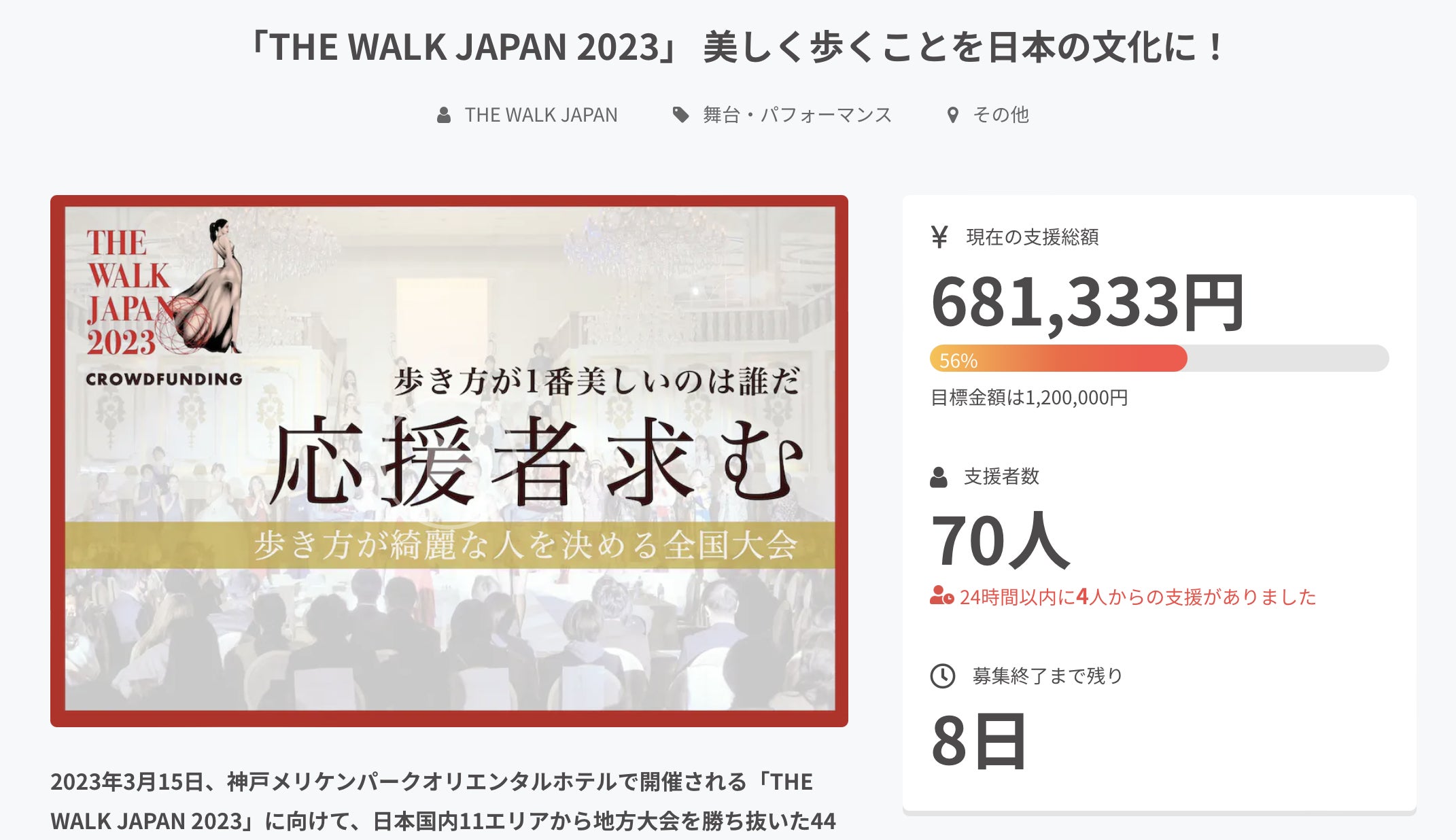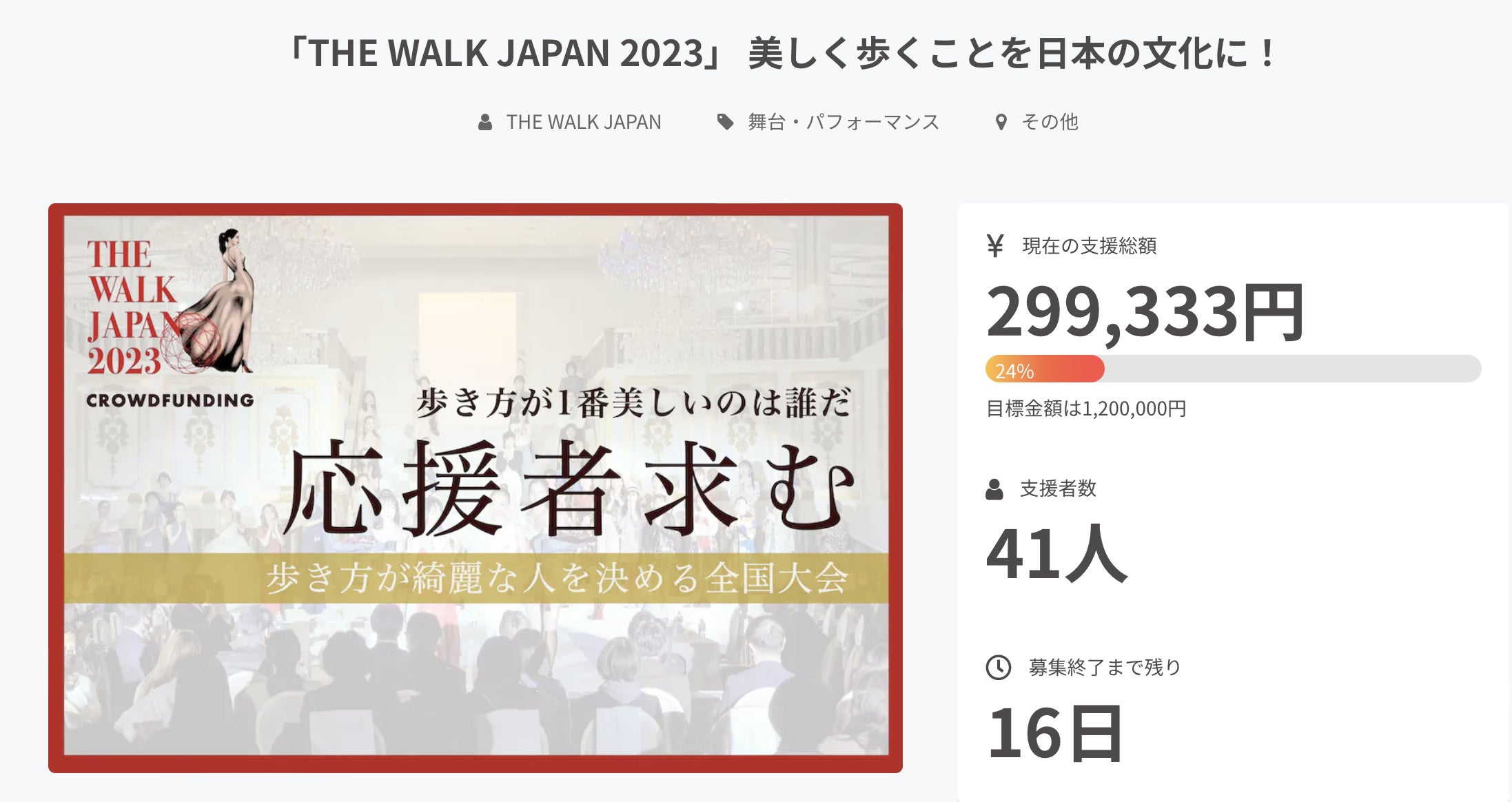 あと3日となりました!!現在87名の方にご支援いただいております。感謝申し上げます!!日本大会の観覧チケットをリターンにて追加いたしました。ご購入がまだの方はクラウドファンディングにて支援購入いただけますと幸いです。 【審査員さまご紹介】THE WALK JAPAN 2023日本大会の審査員の方が決まりましたので、ご紹介させていただきます。 宮本 エリアナ 様2015年ミックスとして初めてミスユニバース日本代表に選出され、世界大会では6位タイ。 その後タレントとして活動をしながら、人種差別や人権問題についての講演会等を行っている。 2児の母、そして最近では俳優としての顔を持ち、 2023年3月放送予定のドラマでは、日本ドラマ史上初の肌の色の違う女性バディがW主人公の連続ドラマ「フェンス」で主演を務めている。 日本のエンタメ業界で新たな扉を開き続けている。西島 数博 様ダンサー・演出振付家。18歳で渡仏、フランスの国際コンクール第1位受賞後、ヨーロッパやアメリカ等の舞台に多数出演。帰国後、スターダンサーズバレエ団にてピーターライト版「コッペリア・くるみ割り人形・ジゼル」やバレエ「ドラゴンクエスト」等に主演。新国立劇場バレエ団や日本バレエ協会公演にも主演。TVドラマ「池袋ウエストゲートパーク」出演から芸能界でも活動。主演映画「るにん」アメリカの映画祭でグランプリ受賞。テレビ番組「笑っていいとも」や「徹子の部屋」等に出演。中島 篤 様2003年 第20回オンワードファッション大賞 グランプリ受賞2004年 渡仏 ジャンポールゴルチェ アシスタントデザイナー就任2018年 大使館の依頼により、インドにてファッションショーを行う2019年トヨタモーターショー衣装デザインを担当塚田良平 様ヴォーカリスト・音楽プロデューサー。声楽家として「長野オリンピック」開会式(小澤征爾 指揮)や「エディンバラ国際フェスティバル」に参加するなど多数のオペラやコンサートに出演。香川県高松市に建設中の「香川アリーナ(仮称)」建設アドバイザーを着工までの3年間担当。2023年新春特番、テレ東「ゴッドタン」第20回芸人マジ歌選手権にバカリズム氏とユニット共演。その他「WORLDWIDE」「LegendTokyo」等ダンスコンテストの審査も務める。観覧チケットはオンライン観覧もリターンにてご用意しております。THE WALK JAPAN 2023日本大会『歩き方が一番美しいのは誰だ!』2023年3月15日(水)ホームページhttps://thewalkjapan.com/場所:神戸メリケンパーク オリエンタルホテル「THE WALK JAPAN 2023」 美しく歩くことを日本の文化に!https://camp-fire.jp/projects/view/651650?utm_campaign=cp_po_share_mypage_projects_show引き続きご支援そしてシェアをお願いいたします。