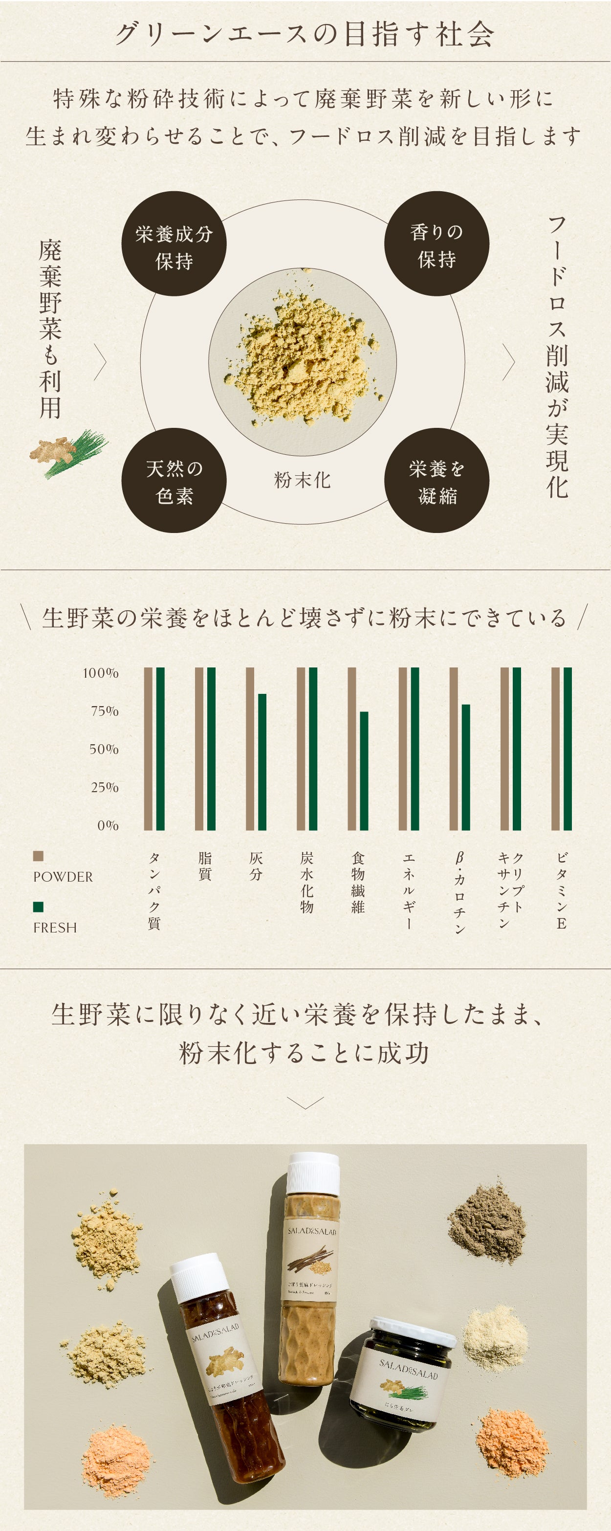 私たちグリーンエースは、フードロスの削減を目指して2015年から粉砕技術の研究開発に取り組んできました。野菜を粉末化することによって水分を飛ばし、加工しやすく、そして保存しやすくすることができます。研究開発の結果、生野菜に限りなく近い栄養を保持したまま、粉末化することに成功しています。生野菜の90%は水分でできているので、粉末化することで野菜の栄養を約10倍濃縮するほど、野菜をぎゅっと濃縮した形なのです。