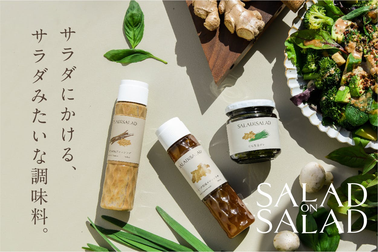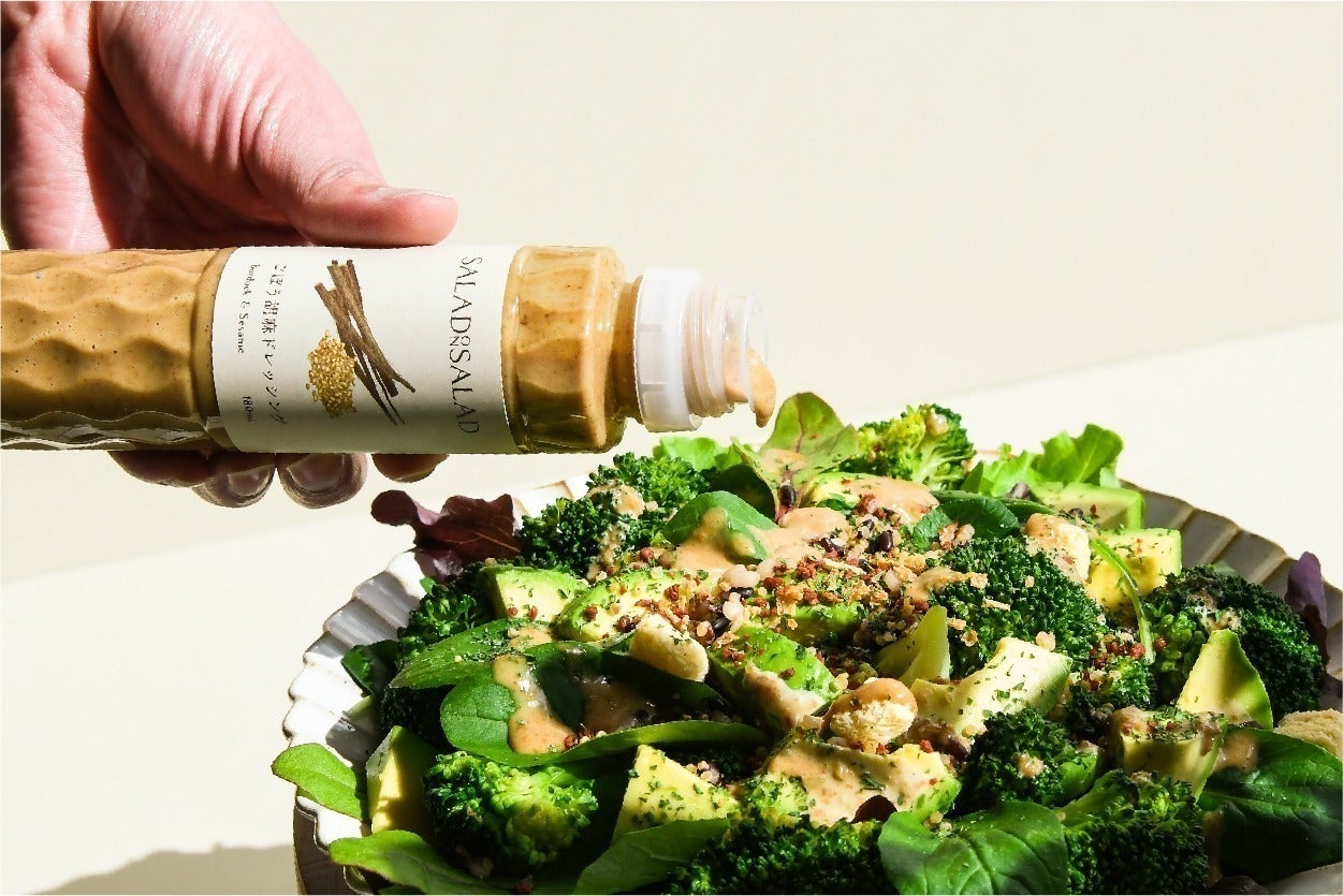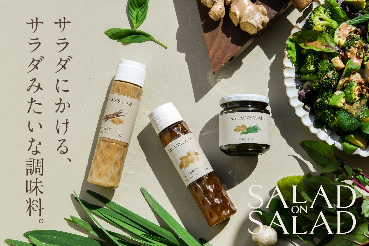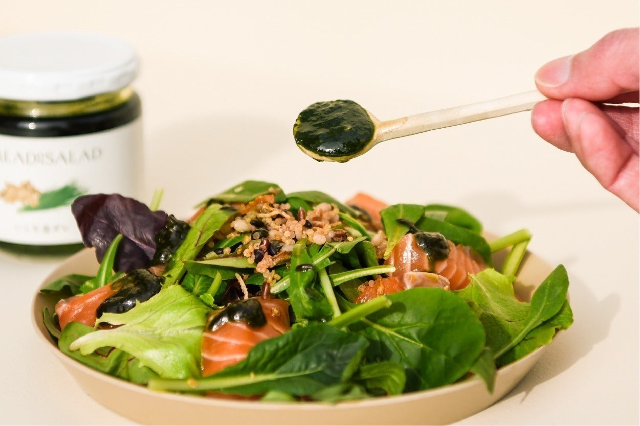 Salad on Salad はいつものサラダをもっと手軽に、栄養たっぷりにしてしまう新しい調味料です。定番の調味料に野菜を足すことで、野菜の風味を感じることができるだけでなく、食物繊維やビタミン、ミネラルといった野菜の栄養も摂ることができます。