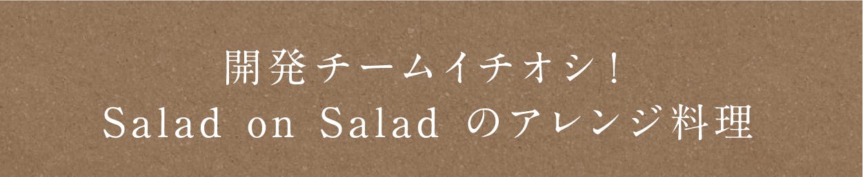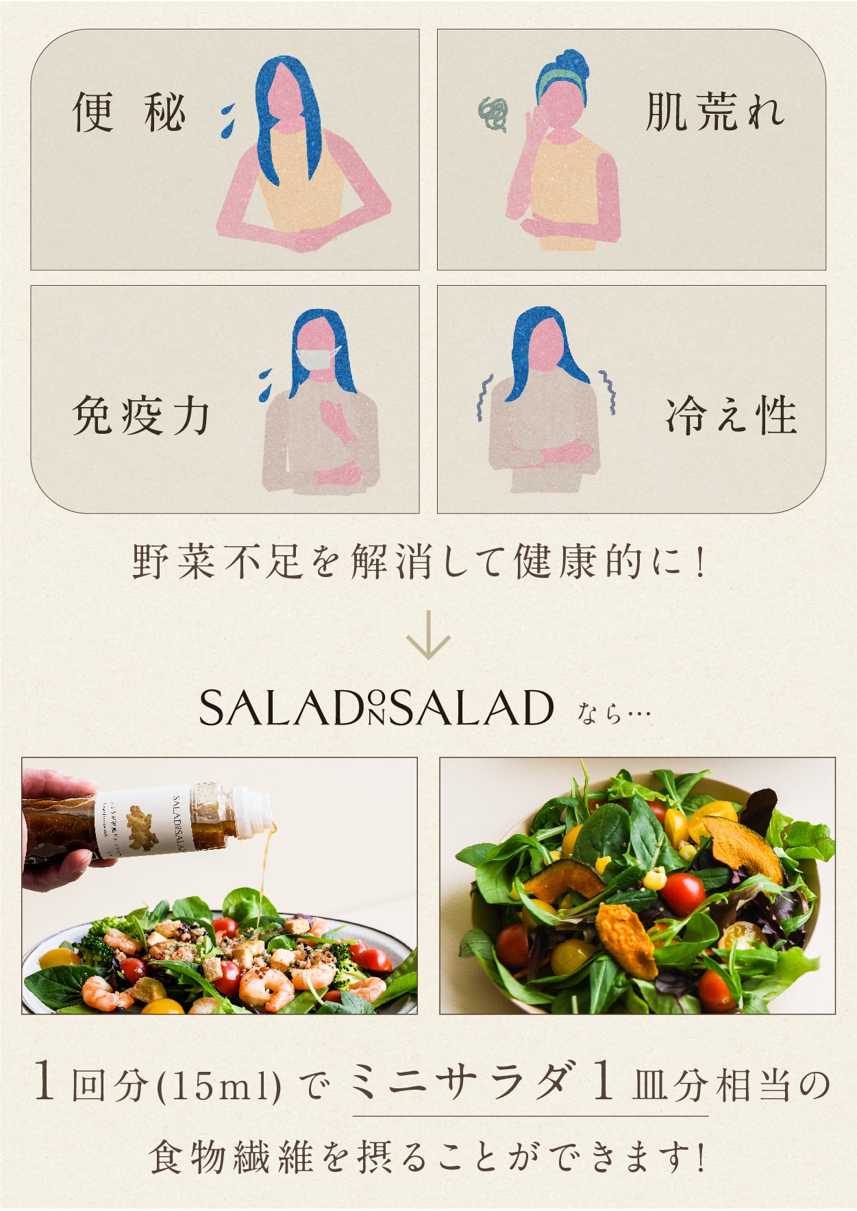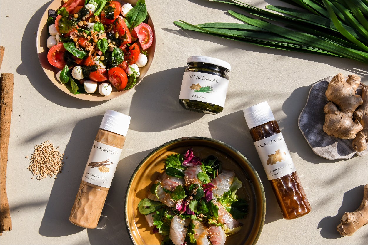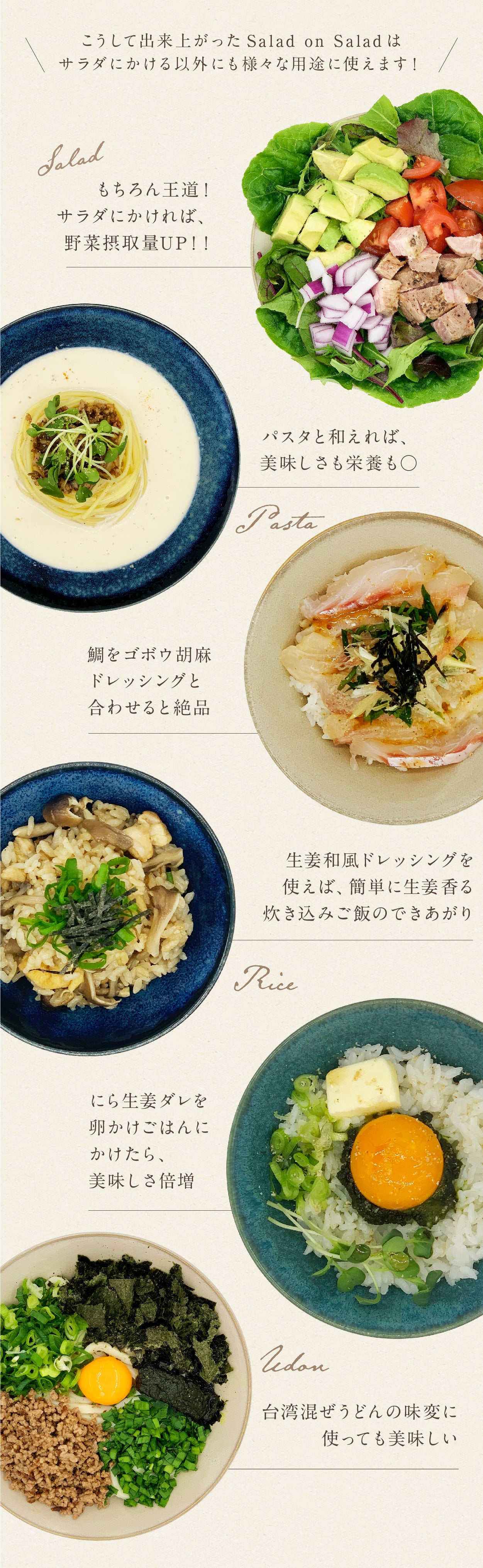 Salad on Salad はいつものサラダをもっと手軽に、栄養たっぷりにしてしまう新しい調味料です。定番の調味料に野菜を足すことで、野菜の風味を感じることができるだけでなく、食物繊維やビタミン、ミネラルといった野菜の栄養も摂ることができます。