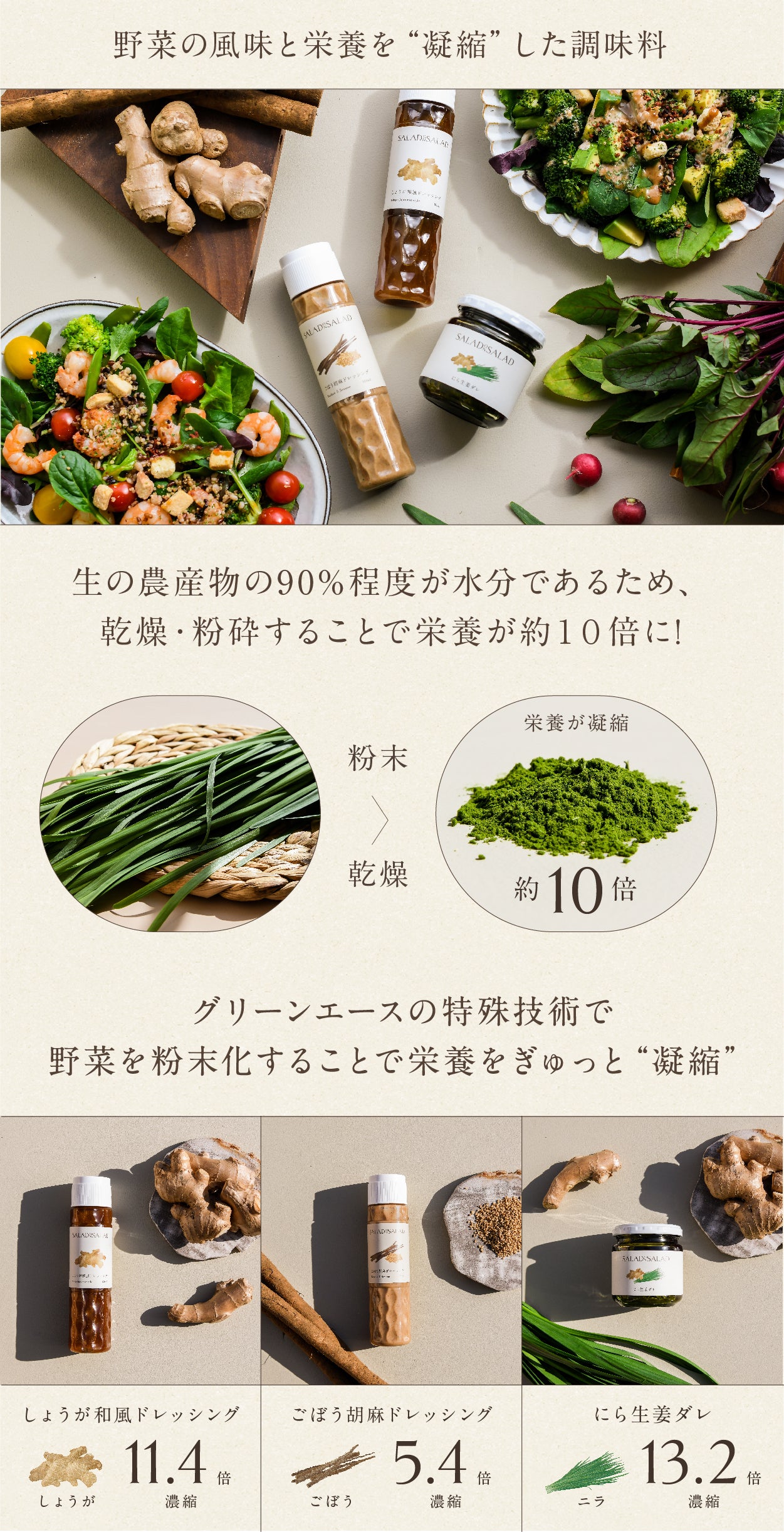 Salad on Salad には、グリーンエースの特殊技術で野菜・果物を 「粉末」 にしたものを使用しています。生の農産物の90%程度が水分であるため、乾燥・粉砕することで約10倍に栄養をぎゅっと “濃縮” することができます。