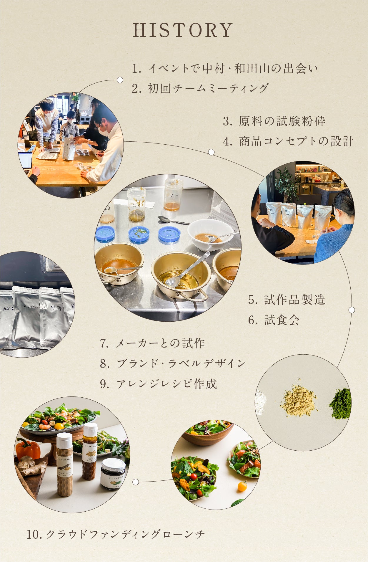 粉末化した野菜の中で、どれを使ってどんなドレッシングをつくれば、美味しくて使いやすいものができるのか。思いついたものをどんどん試していきました。なかなか味のベースも決まらず苦戦したため、プロジェクトメンバー全員でキッチンを借りて、1日で数十種類のドレッシングを試してみた日もありました。シェアキッチン・オフィスに居た人たちにも食べてもらったり、アイディアを出してもらったりする中で、ようやく野菜粉末と相性の良いドレッシングが見つかってきました。