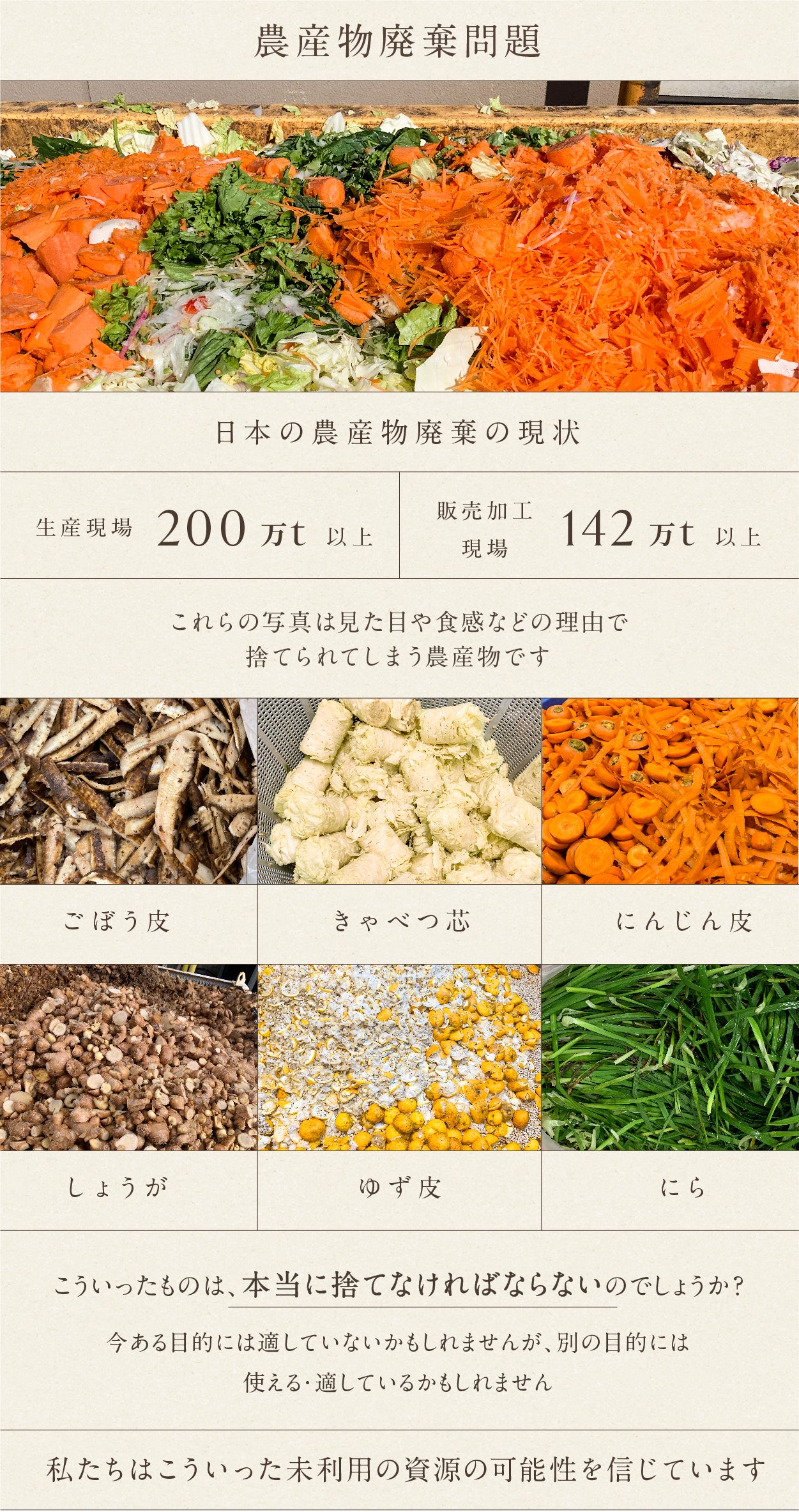 フードロスは「もったいない」だけではありません。この食べ物を作り、運び、そして捨てるためにたくさんのお金や労力、エネルギーが無駄になっています。これら廃棄される食品は、本当に「ゴミ」なのでしょうか。形を変えれば、きっと素敵な食べ物になると、私たちは信じています。