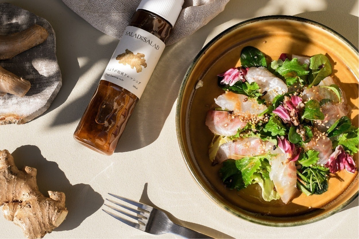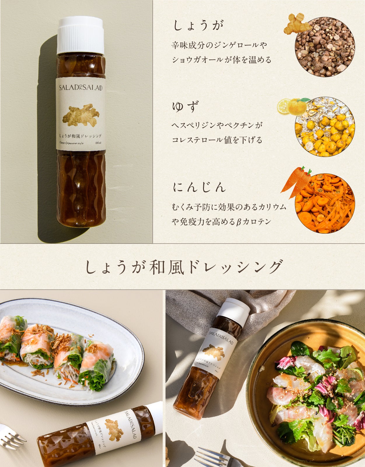 これらの栄養豊富な野菜を加えた和風ドレッシングに、柚子胡椒や玉ねぎを足して、コクのある美味しいドレッシングに仕上げました。ドレッシングはピリッと辛く、食べると喉のあたりがポカポカするのも生姜を感じられます。