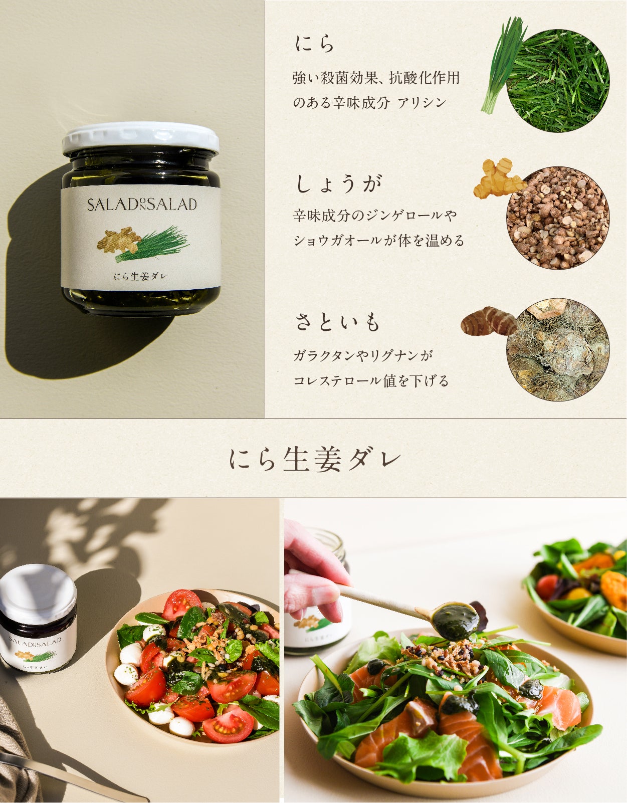 そして変わり種、アレンジ無限のにら生姜ダレ。ごま油をベースに、ニラと生姜、里芋の粉末を混ぜることでヤミツキになる風味に仕上げました。