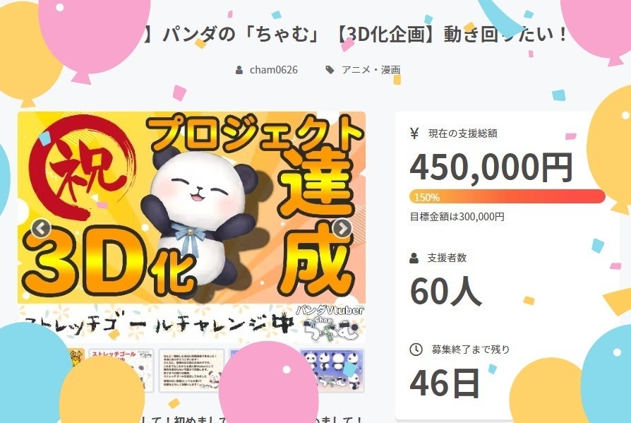 150%達成!!!!!60人のサポーター様、暖かいご支援をありがとうございます!!こんちゃむ!パンダVtuberの「ちゃむ」です。なんと…募集終了までまだ46日あるのですが…皆様の優しいご支援が達成率150%をたたき出しました…₍ ᐢ. ̫ .ᐢ ₎す、すごい…本当に感謝してもし足りないくらいなので、3Dの身体になったらたくさん動いて癒しをお届けしたいと思います!!待っててね!このあと、150%から先は「夏衣装」と「ディスプレイ」となっております。200%はゴニョゴニョ…ゴニョ…です₍ ᐢ. ̫ .ᐢ ₎ゴニョ…説明欄に書いてある通りだよ…!!!!!残り46日、無理しすぎず一緒に最終日を見届けてくれたら嬉しいです♡よろしくお願いします!