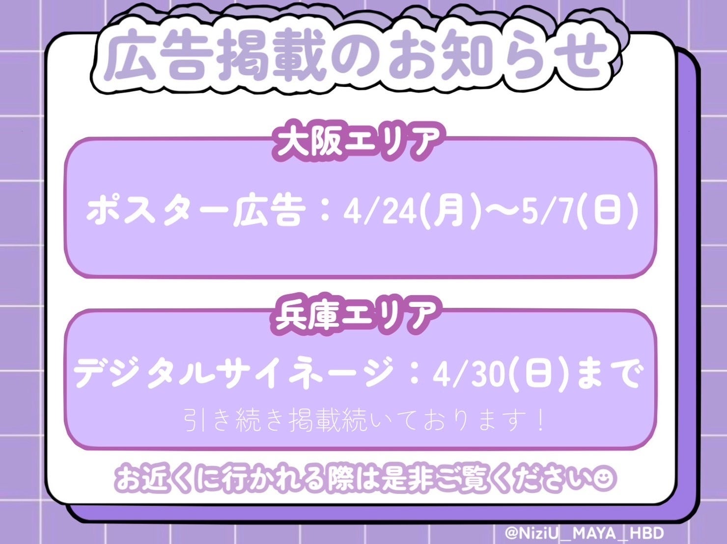 支援者の皆さま現在、各地域での広告掲載が開始されております。皆様のご支援、ご協力のおかげです、改めて感謝申し上げます。大阪エリア 大阪駅ポスター広告について、一部内容に誤りがありました。ご支援してくださった方、既に広告を観覧しに行った方、この度は大変申し訳ございません。現在の大阪エリア 大阪駅ポスター広告の掲載期間が終了した後、改めて大阪エリア 大阪駅ポスター広告を掲載させていただくことが決まりました。期間は、4/24(月)~5/7(日)になります。※広告再掲載に要する費用に関して皆様から改めて募ることはありません。また、変更点や追加のお知らせがある場合はTwitter@NiziU_MAYA_HBD ならびにcampfire内のメッセージでお知らせ致します。4/8の誕生日を盛大にお祝いできるよう運営一同努めてまいりますので、最後までよろしくお願い致します。マヤ誕生日企画2023運営