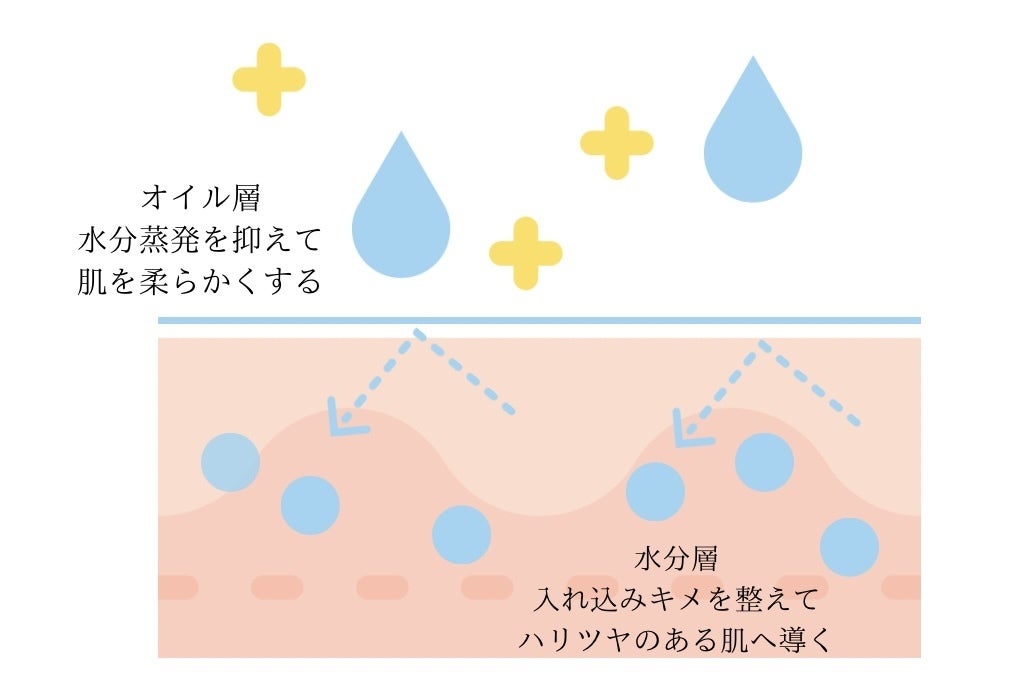 " glow oil in water " は二層で肌へアプローチ!オイル層と水分層それぞれの効果で肌の内と外から潤いを与えます。
