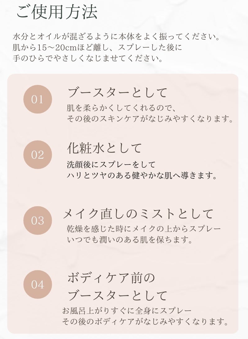 〈保管及び取扱い上の注意〉●よく振ってからご使用ください。●ご使用後は必ずしっかりキャップを閉めてください。●天然成分を配合しているため、収穫時期等や経時、光や温度変化によって香りや色が変化することがありますが、品質には問題ございません。●直射日光の当たる場所や、極端に低温、高温多湿な場所には保管しないでください。●乳幼児の手の届かない所に保管してください。●いったん手にとった化粧品は、容器に戻さないでください。中身が変質することがあります。