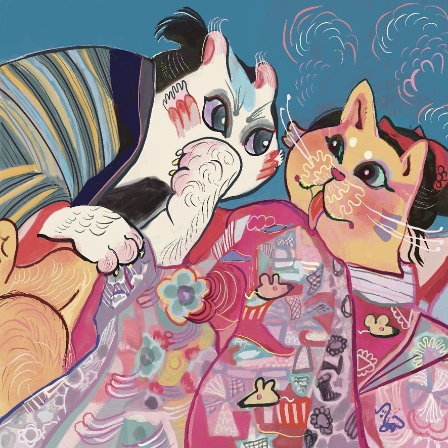 オラは頭に浮かんだ猫や女の子の絵をフワフワした色彩や、浮世絵風に描いています。