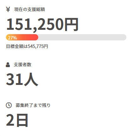 現在の調達率は27%、パトロン様は31名となっております。