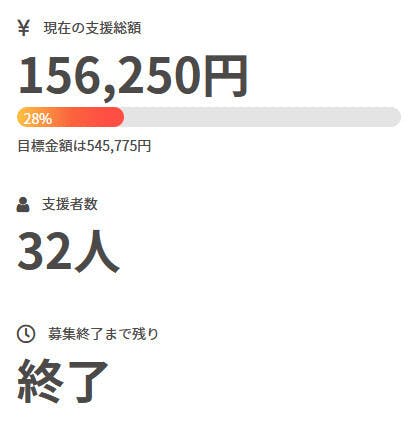 このプロジェクトは、2023/01/19に募集を開始し、 32人の支援により 156,250円の資金を集め、 2023/02/28に募集を終了しました