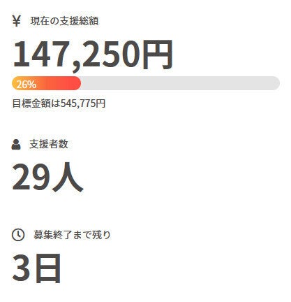 お世話になっております。 名無しの東北県人です。 前回の活動報告から現在までの間に、 新たに1名の方がご支援を行って下さいました。 現在の調達率は26%、パトロン様は29名となっております。 本当にありがとうございます。 引き続き、何卒宜しくお願い致します。