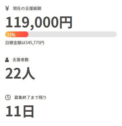 お世話になっております。 名無しの東北県人です。 前回の活動報告から現在までの間に、 新たに1名の方がご支援を行って下さいました。 現在の調達率は21%、パトロン様は22名となっております。 本当にありがとうございます。 引き続き、何卒宜しくお願い致します。