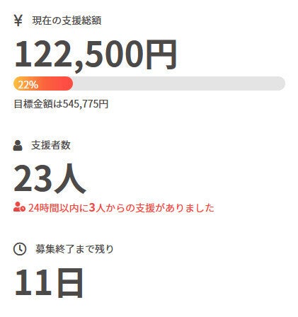 お世話になっております。 名無しの東北県人です。 前回の活動報告から現在までの間に、 新たに1名の方がご支援を行って下さいました。 現在の調達率は23%、パトロン様は25名となっております。 本当にありがとうございます。 引き続き、何卒宜しくお願い致します。
