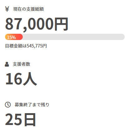 お世話になっております。 名無しの東北県人です。 前回の活動報告から現在までの間に、 新たに1名の方がご支援を行って下さいました。 現在の調達率は15%、パトロン様は16名となっております。 本当にありがとうございます。 引き続き、何卒宜しくお願い致します。