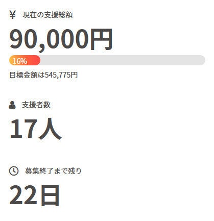 お世話になっております。 名無しの東北県人です。 前回の活動報告から現在までの間に、 新たに1名の方がご支援を行って下さいました。 現在の調達率は16%、パトロン様は17名となっております。 本当にありがとうございます。 引き続き、何卒宜しくお願い致します。