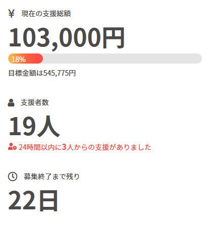 お世話になっております。 名無しの東北県人です。 前回の活動報告から現在までの間に、 新たに1名の方がご支援を行って下さいました。 現在の調達率は18%、パトロン様は19名となっております。 本当にありがとうございます。 引き続き、何卒宜しくお願い致します。
