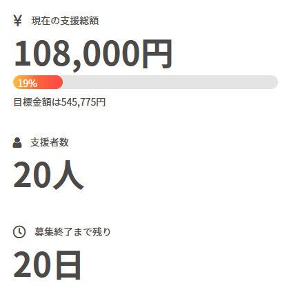 お世話になっております。 名無しの東北県人です。 前回の活動報告から現在までの間に、 新たに1名の方がご支援を行って下さいました。 現在の調達率は19%、パトロン様は20名となっております。 本当にありがとうございます。 引き続き、何卒宜しくお願い致します。