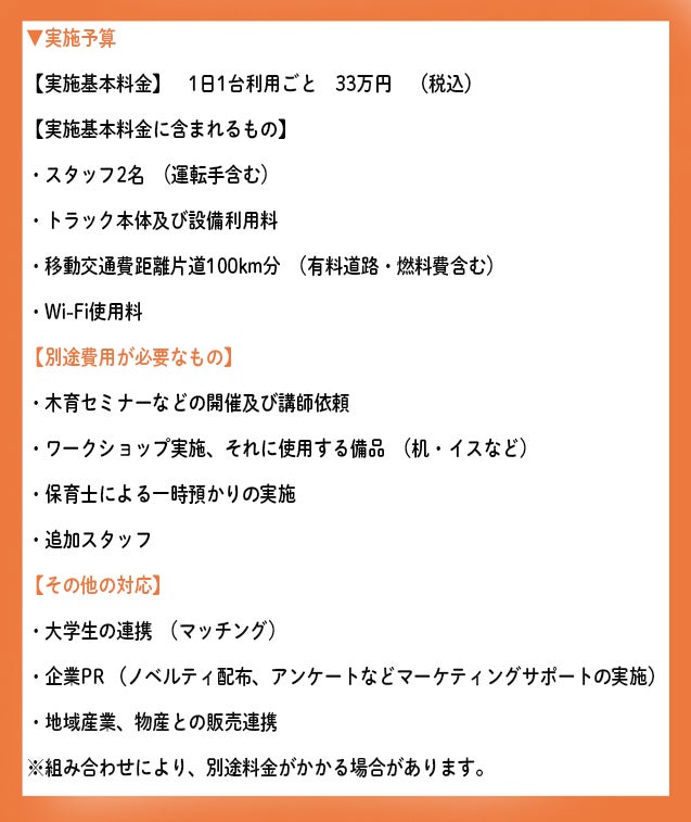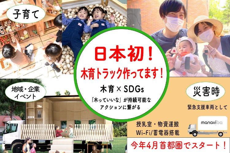 自社の被災をきっかけに子育てをサポートする装備を備え、災害時にも支援ができる1台で多機能な木育トラックをつくりたい!と思い、今回のプロジェクトを立ち上げ、2024年1月「木育トラック」製作が始まりました。この「木育トラック manaviba」を全国に広げていきたい!まずは首都圏で運用します!全国に木育、子育て支援の輪を広げる挑戦しています!