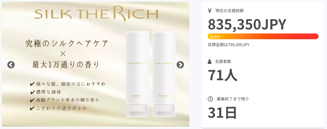 皆さま、こんにちは!高橋です^^クラウドファンディング終了まで残り約1週間ということで、私から簡単にメッセージをお届けしたいと思います。まずクラファンの現状としては、総計86名の方からご支援いただきまして総支援額が92万円となっております^^これまで沢山のご支援を誠にありがとうございます!!もしかすると、「なんで高橋がシャンプー&トリートメントなんて出してるの?」と思われている方も改めていらっしゃるかもしれませんので、この場をお借りして「私とSILK THE RICHの出会い」について語らせてください。昨年に株式会社THE RICHを創業する際、私含め3名でこの会社を立ち上げることとなりました。私高橋、現会長の三浦、CTOの小濱です。三浦のビジョンである「創業当初からグローバルで挑戦する」という目標を聞き、私自身もグローバルで多くの方に愛され使われ続けるプロダクトを一緒に作りたいと当時思ったのを覚えています。これが私とSILK THE RICHとの最初の出会いであり、今も変わらない同ブランドの方向性です。SILK THE RICHは、ただのシャンプー&トリートメントメーカーにあらず、より多くの方に最高品質のシャンプー&トリートメントをご実感いただくための「ビューティ×テクノロジー」など含め、様々な展開を考えています。今後の皆様の購入体験も今よりもっと良いものへと変わりひとつひとつの瞬間がかけがえのないものになること間違いなしです。そのビジョンについてはまた改めてご共有させていただければと思いますが、このクラウドファンディングを終えて更にパワーアップしていくことも視野に入れています。クラウドファンディングをスタートして本当に様々な方からご支援いただけたこと大変嬉しく思います。皆様、誠にありがとうございます。4月の本商品リリースとその後の展開含めて、皆様にご共有させていただける日を心待ちにしております。引き続きSILK THE RICHをよろしくお願いいたします^^