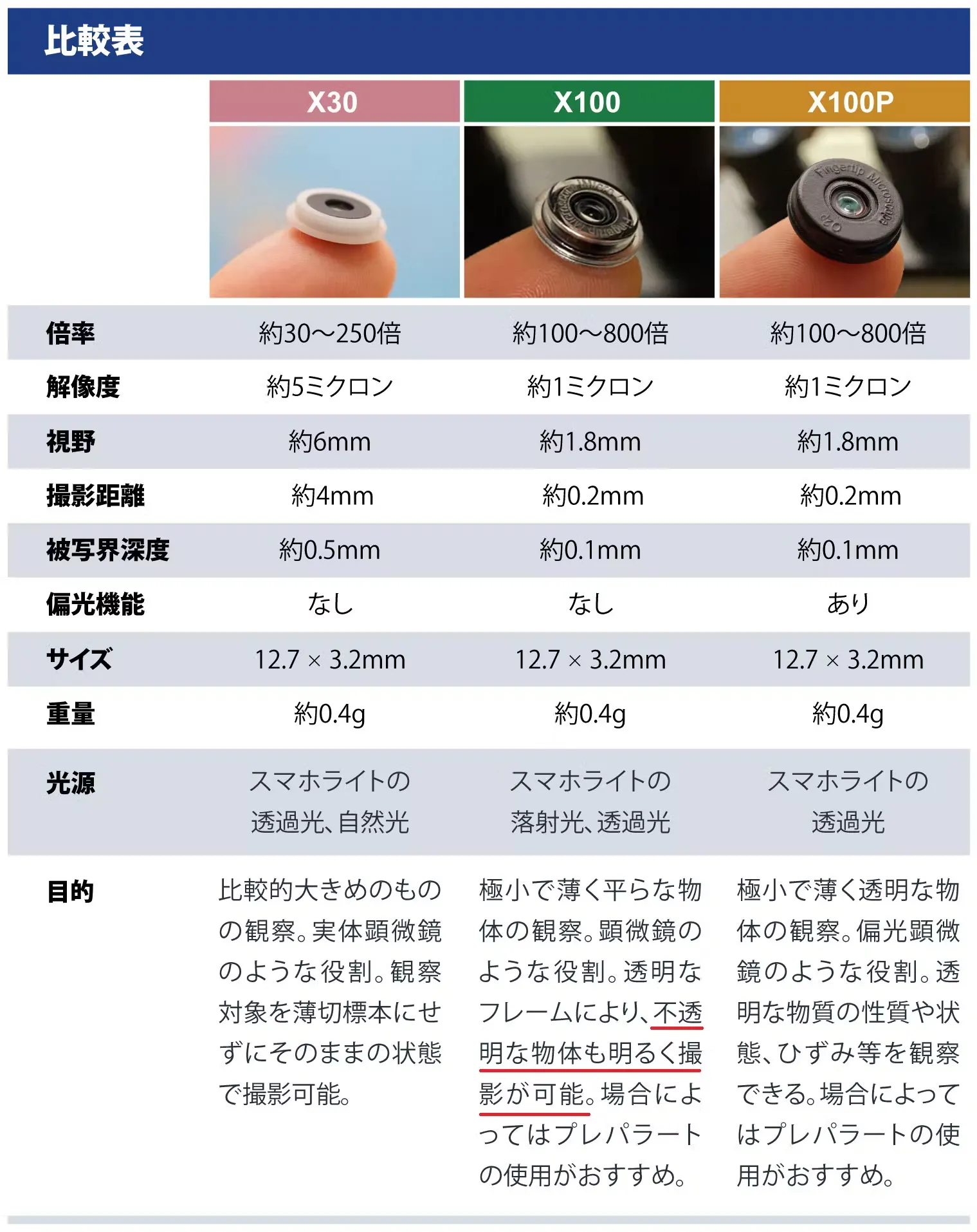 X100は偏光機能の付いていないシンプルな高倍率レンズ(倍率は約100~800倍)です。