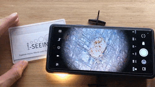 スマホのカメラへの取り付けはとても簡単です。 装着後は、見たいものに近づけるだけ。お手軽にミクロの世界を楽しんで下さい♪