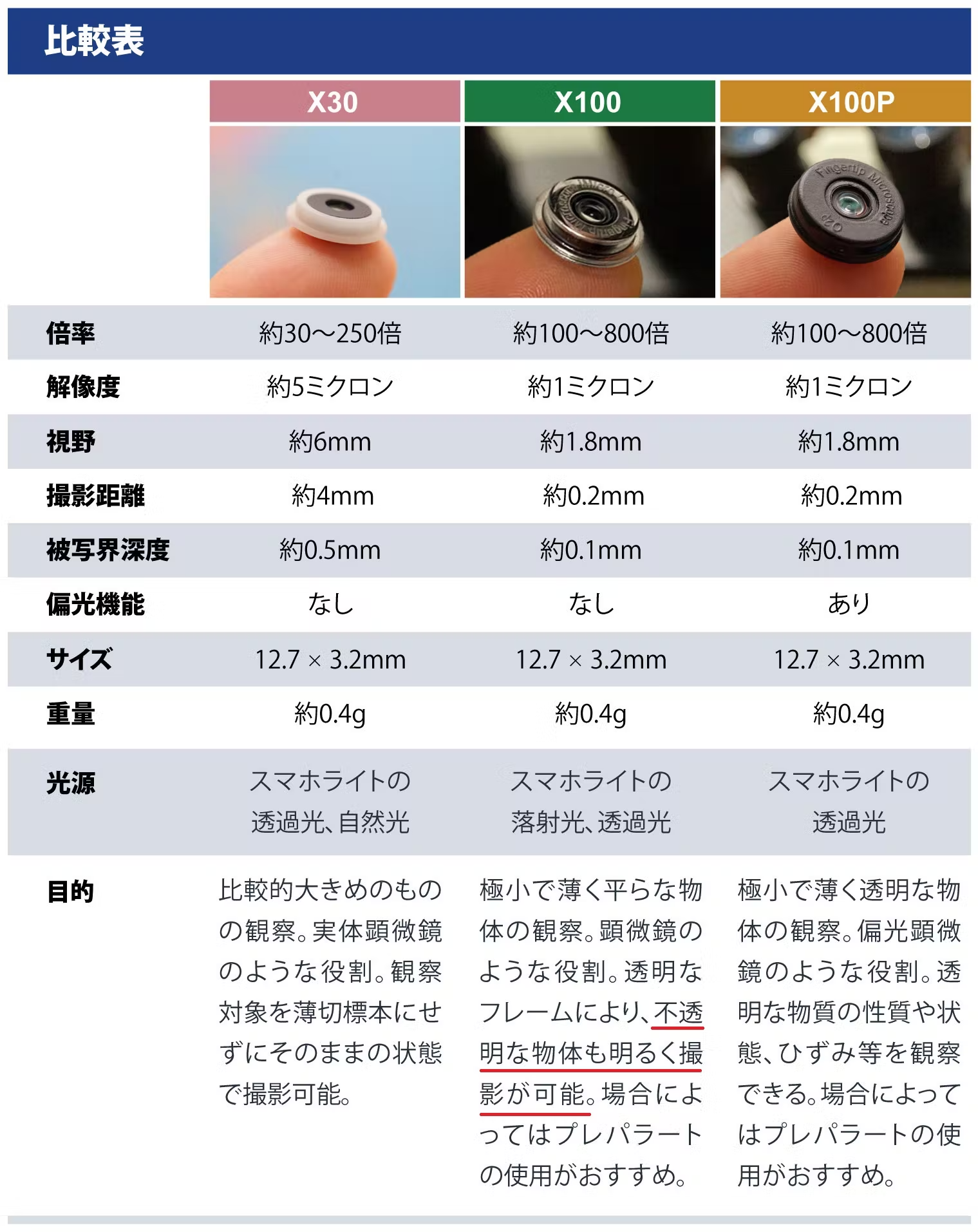 X100は偏光機能の付いていないシンプルな高倍率レンズ(倍率は約100~800倍)です。