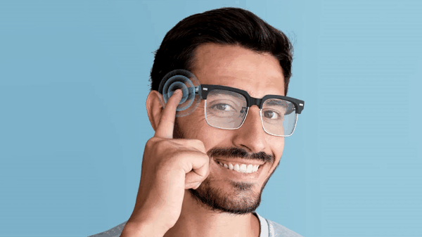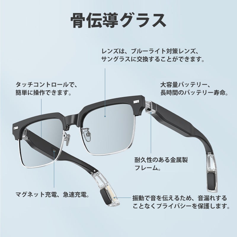 この骨伝導スマートグラスはメガネのテンプルエンド部分が曲がり耳の後ろで骨伝導として音を伝えます。また集音機能付きで大変便利です