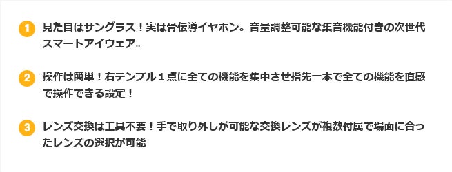 見た目は普通のサングラスですが、テンプル右側のみに機能を集中させた「タップ操作」「位置調整可能な骨伝導スピーカー」「水に強い」「工具無しで簡単レンズ交換」機能付きで音声通話が可能で長時間の使用時も楽な軽量設計に仕上げた高級志向なサングラスです。
