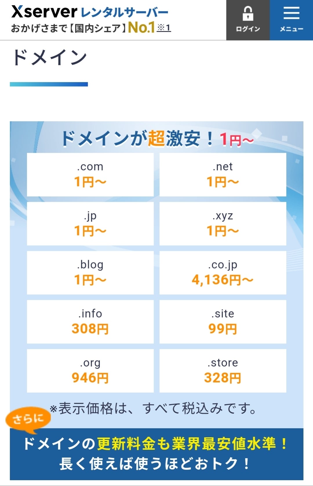 ドメイン(ホームページアドレスの名前使用料金)代 1円