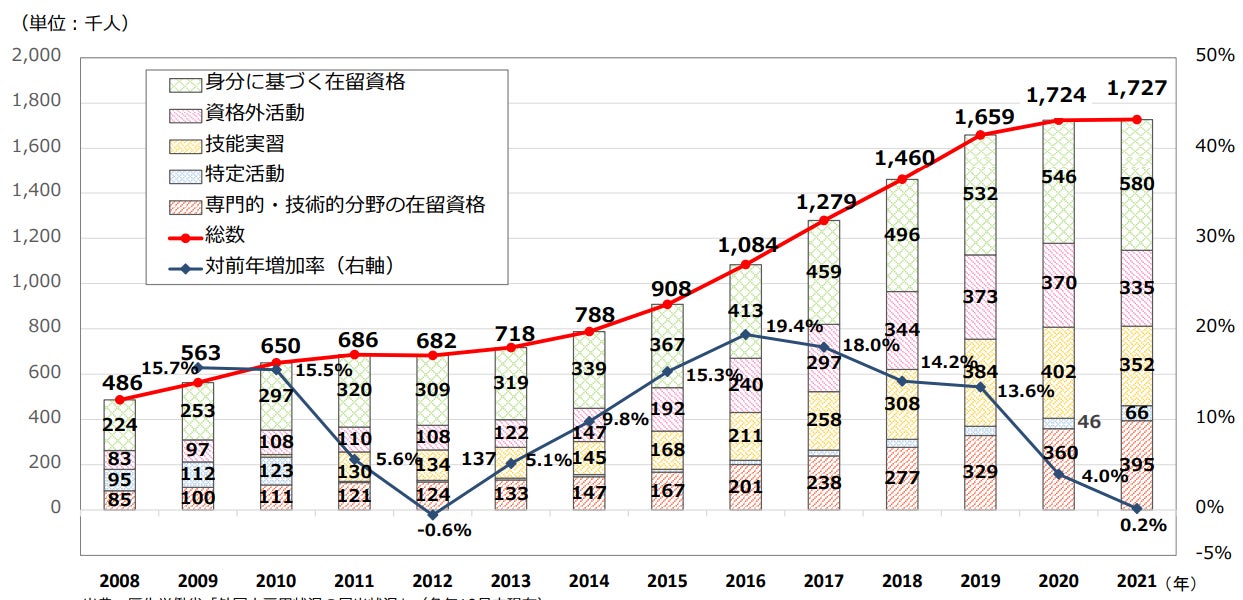 ・日本に暮らす外国人の方々は、毎年増え続けています。少子高齢化による、働き手の不足で、外国人労働者は年々増えていきます。(厚労省HP:「外国人雇用状況」の届出状況まとめ (令和3年10月末現在)より)