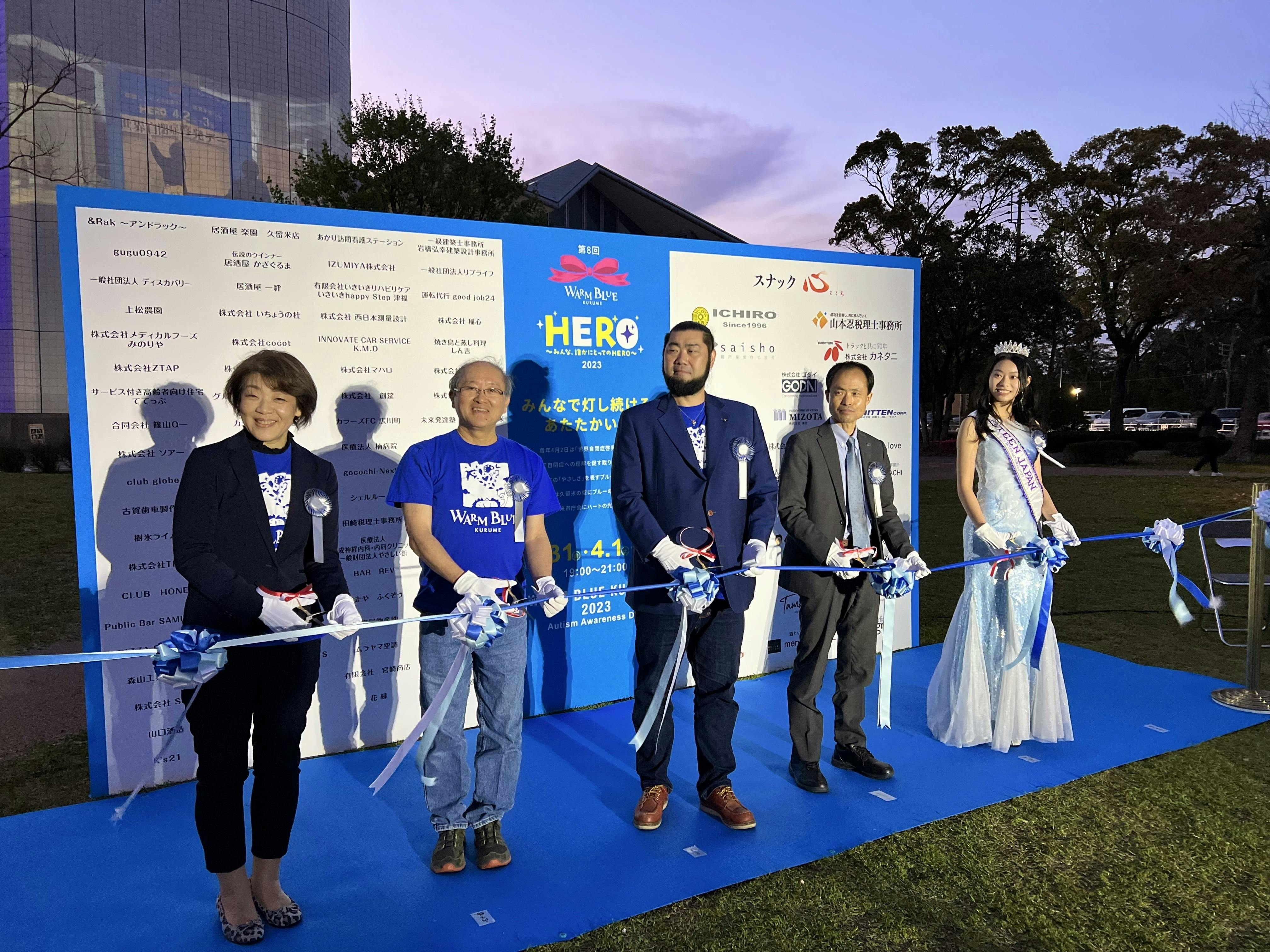 2023/04/01 21:004月1日(土)久留米庁舎横の両替町公園にてセレモニーを行い、みなさまのおかげで無事に終えることが出来ました。オープニングアクトにCOOL.M.B!久留米市長を始め、久留米市議会議員 甲斐田先生、久留米大学病院・小児科主任教授 山下教授 、gocochi-Next松尾代表、Miss Teen international 日本代表 山本真帆などたくさんのゲストをお迎えし、セレモニーを開催。明日4月2日(日)Warm Blue KURUMEはみなさんの想いを久留米の夜空にブルーの花火を打ち上げます!【場所や時間は非公開】久留米市役所のライトアップも4月2日(日)まで行っていますので、お近くにお越しの際はご覧になってください。イベント終了後も「みんな、誰かにとってHERO」そんな社会の実現に向け我々は動き続けていきます。 もっと見る